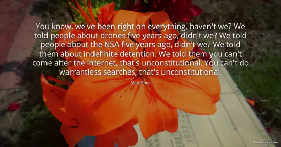 Shea, Matt. "You know, we've been right on everything, haven't we? We told people about drones five years ago, didn't we? We told people about the NSA five years ago, didn't we? We told them about indefinite detention. We told them you can't come after the internet, that's unconstitutional. You can't do warrantless searches, that's unconstitutional." FixQuotes. February 9, 2026. https://fixquotes.com/quotes/you-know-weve-been-right-on-everything-havent-we-185004/.