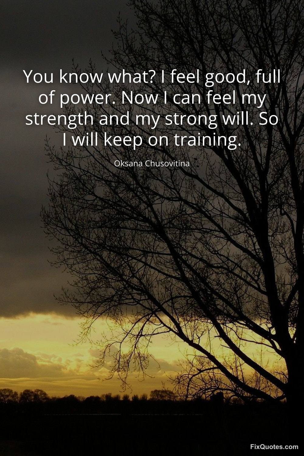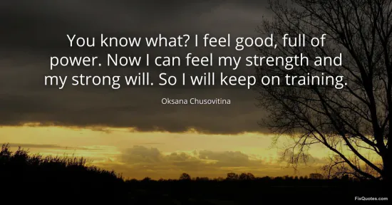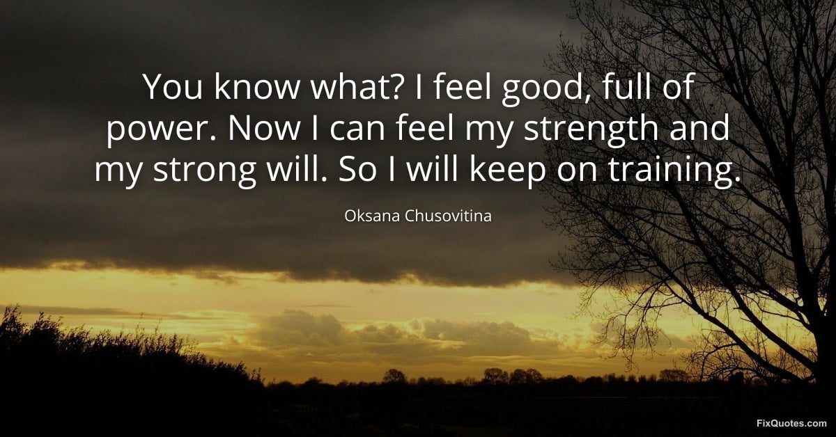 Chusovitina, Oksana. (2026, February 16). You know what? I feel good, full of power. Now I can feel my strength and my strong will. So I will keep on training. FixQuotes. https://fixquotes.com/quotes/you-know-what-i-feel-good-full-of-power-now-i-can-185474/