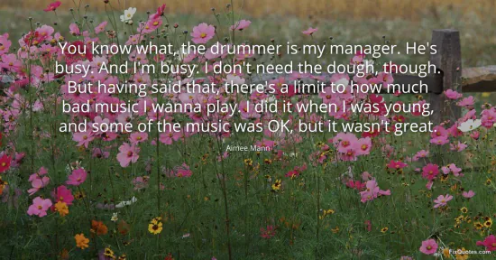 Mann, Aimee. "You know what, the drummer is my manager. He's busy. And I'm busy. I don't need the dough, though. But having said that, there's a limit to how much bad music I wanna play. I did it when I was young, and some of the music was OK, but it wasn't great." FixQuotes. January 17, 2026. https://fixquotes.com/quotes/you-know-what-the-drummer-is-my-manager-hes-busy-74400/.