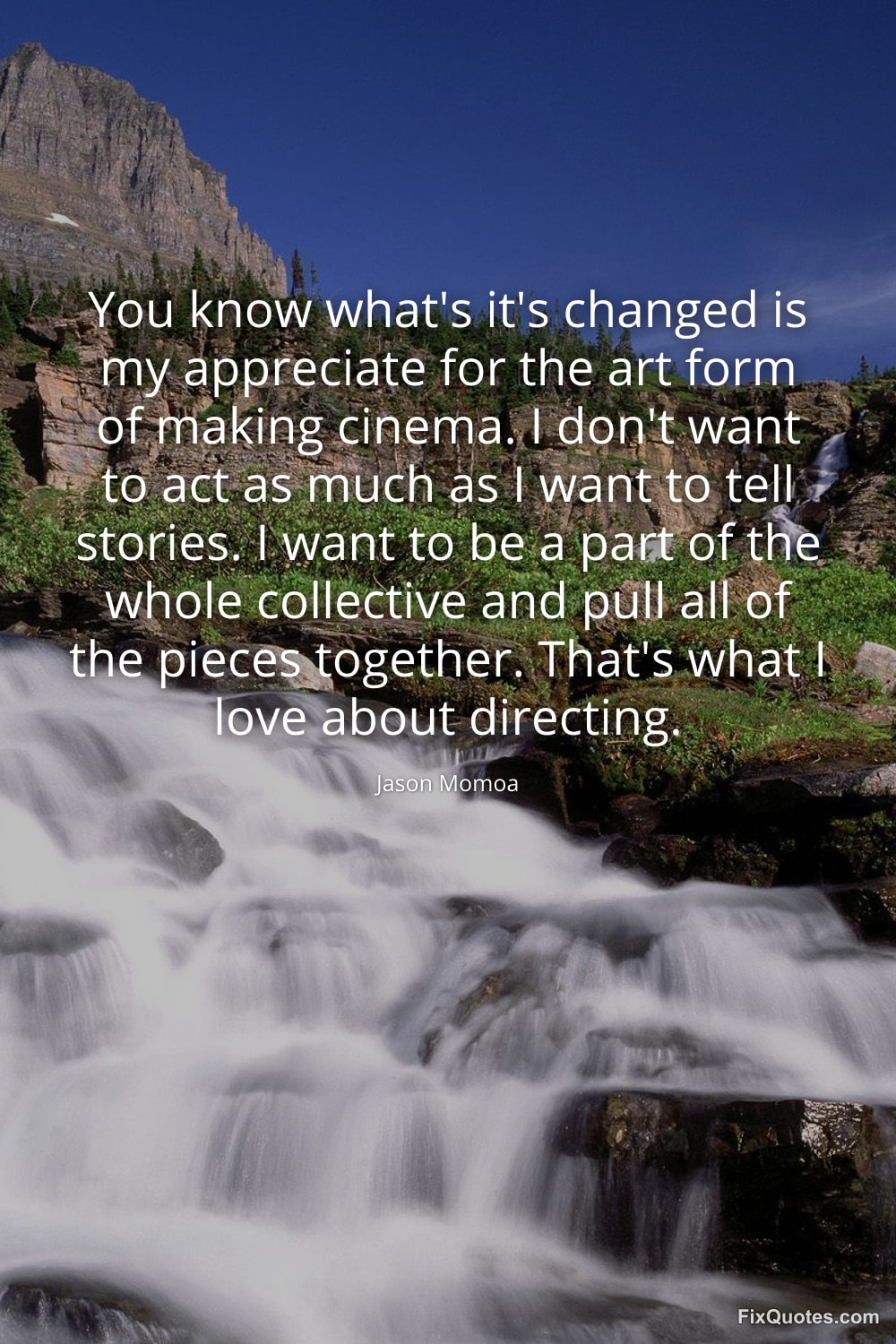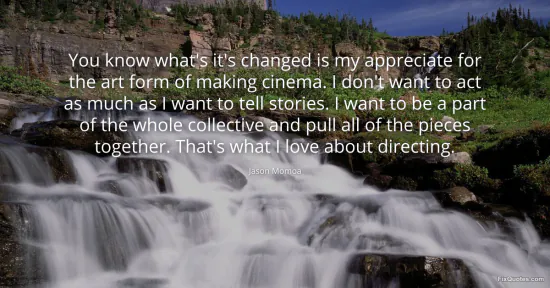 Momoa, Jason. (2026, January 26). You know what's it's changed is my appreciate for the art form of making cinema. I don't want to act as much as I want to tell stories. I want to be a part of the whole collective and pull all of the pieces together. That's what I love about directing. FixQuotes. https://fixquotes.com/quotes/you-know-whats-its-changed-is-my-appreciate-for-184504/