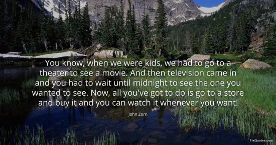 Zorn, John. "You know, when we were kids, we had to go to a theater to see a movie. And then television came in and you had to wait until midnight to see the one you wanted to see. Now, all you've got to do is go to a store and buy it and you can watch it whenever you want!" FixQuotes. January 16, 2026. https://fixquotes.com/quotes/you-know-when-we-were-kids-we-had-to-go-to-a-86864/.