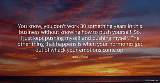 Then she swerves into something pop culture still struggles to say plainly: physiology has a vote. "When your hormones get out of whack your emotions come up" cuts against the old showbiz myth that professionalism is pure mind over matter. Osmond isn’t romanticizing breakdown or packaging vulnerability as branding; she’s naming a mechanism. The subtext is that resilience, especially for women in entertainment, gets framed as moral character when it’s often chemistry plus circumstance. Hormonal shifts - menopause, postpartum, stress - are treated as private mess, yet they can be career-shaping forces.