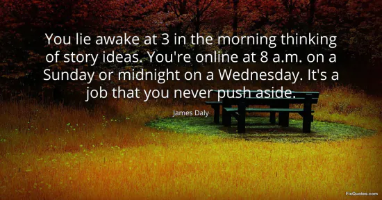 Daly, James. "You lie awake at 3 in the morning thinking of story ideas. You're online at 8 a.m. on a Sunday or midnight on a Wednesday. It's a job that you never push aside." FixQuotes. January 16, 2026. https://fixquotes.com/quotes/you-lie-awake-at-3-in-the-morning-thinking-of-102173/.
