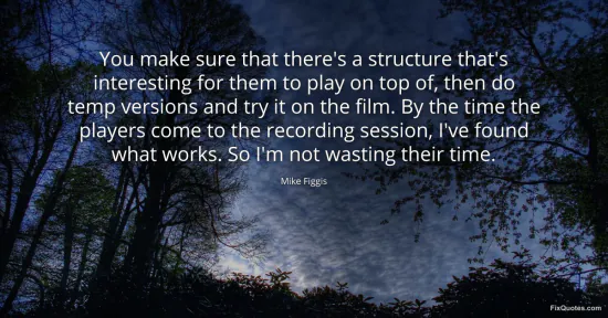 Figgis, Mike. "You make sure that there's a structure that's interesting for them to play on top of, then do temp versions and try it on the film. By the time the players come to the recording session, I've found what works. So I'm not wasting their time." FixQuotes. January 18, 2026. https://fixquotes.com/quotes/you-make-sure-that-theres-a-structure-thats-16107/.