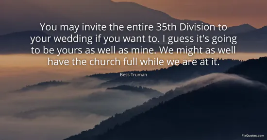 The “entire 35th Division” is not just a crowd; it’s a symbol of Harry Truman’s identity at the time - Captain Truman, veteran, and comrades’ man. By naming the unit, Bess acknowledges that she isn’t marrying only an individual, she’s marrying the network of loyalties that comes with him: men who shared mud, fear, and pride. The joke lands because it’s plausible. Truman’s bonds to fellow soldiers were famously durable, and Bess, who prized privacy, understood early that her life would be interrupted by other people’s claims.
