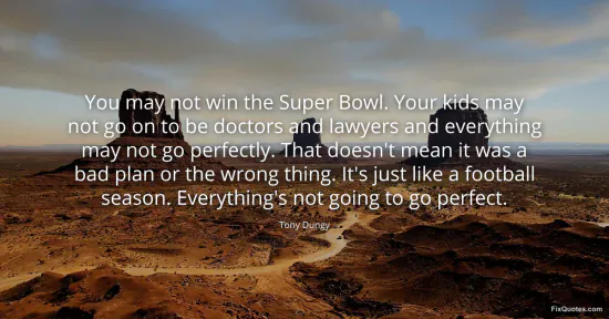 Dungy, Tony. "You may not win the Super Bowl. Your kids may not go on to be doctors and lawyers and everything may not go perfectly. That doesn't mean it was a bad plan or the wrong thing. It's just like a football season. Everything's not going to go perfect." FixQuotes. January 16, 2026. https://fixquotes.com/quotes/you-may-not-win-the-super-bowl-your-kids-may-not-105548/.