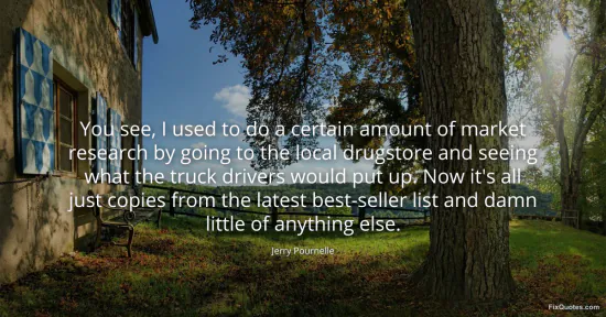 Pournelle, Jerry. "You see, I used to do a certain amount of market research by going to the local drugstore and seeing what the truck drivers would put up. Now it's all just copies from the latest best-seller list and damn little of anything else." FixQuotes. January 16, 2026. https://fixquotes.com/quotes/you-see-i-used-to-do-a-certain-amount-of-market-122321/.