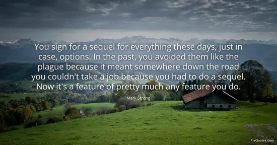 Hollywood used to treat sequels like a mild professional illness: something you caught only if you weren’t careful with contracts. Mark Strong is pointing at the moment that logic flipped, when “options” stopped being a wary compromise and became the default setting of studio filmmaking. The line lands because it’s delivered in the language of labor, not art. “You sign” is blunt, transactional; it frames creativity as a workflow managed by paperwork. The repetition of “feature” is a neat little sting, too: what counts as a “feature” of your career is now the obligation to reproduce the feature you just made.