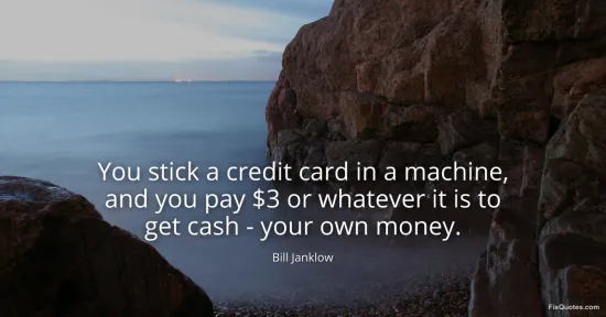 Janklow, Bill. "You stick a credit card in a machine, and you pay $3 or whatever it is to get cash - your own money." FixQuotes. January 17, 2026. https://fixquotes.com/quotes/you-stick-a-credit-card-in-a-machine-and-you-pay-56558/.