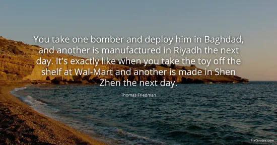 Friedman, Thomas. (2026, January 16). You take one bomber and deploy him in Baghdad, and another is manufactured in Riyadh the next day. It's exactly like when you take the toy off the shelf at Wal-Mart and another is made in Shen Zhen the next day. FixQuotes. https://fixquotes.com/quotes/you-take-one-bomber-and-deploy-him-in-baghdad-and-107945/