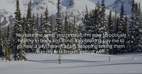 Kidder, Margot. "You take the cards you're dealt. I'm now ferociously healthy in body and mind. You couldn't pay me to go near a psychiatrist again. Stopping seeing them was my first step to getting well." FixQuotes. January 15, 2026. https://fixquotes.com/quotes/you-take-the-cards-youre-dealt-im-now-ferociously-162410/.