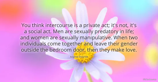 "You think intercourse is a private act; it's not, it's a social act. Men are sexually predatory in life; and women are sexually manipulative. When two individuals come together and leave their gender outside the bedroom door, then they make love"