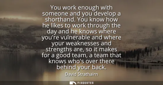 "You work enough with someone and you develop a shorthand. You know how he likes to work through the day and he knows where you're vulnerable and where your weaknesses and strengths are, so it makes for a good team, a team that knows who's over there behind your back"