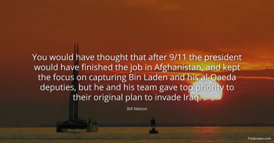 Nelson, Bill. (2026, January 17). You would have thought that after 9/11 the president would have finished the job in Afghanistan, and kept the focus on capturing Bin Laden and his al-Qaeda deputies, but he and his team gave top priority to their original plan to invade Iraq. FixQuotes. https://fixquotes.com/quotes/you-would-have-thought-that-after-9-11-the-66728/