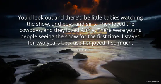 Peters, Bernadette. (2026, January 18). You'd look out and there'd be little babies watching the show, and boys and girls. They loved the cowboys, and they loved Annie. There were young people seeing the show for the first time. I stayed for two years because I enjoyed it so much. FixQuotes. https://fixquotes.com/quotes/youd-look-out-and-thered-be-little-babies-17936/