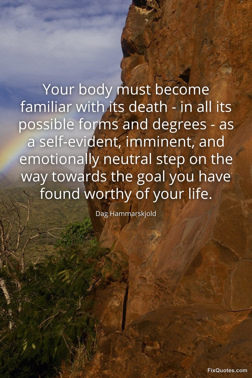 Hammarskjold, Dag. (2026, January 18). Your body must become familiar with its death - in all its possible forms and degrees - as a self-evident, imminent, and emotionally neutral step on the way towards the goal you have found worthy of your life. FixQuotes. https://fixquotes.com/quotes/your-body-must-become-familiar-with-its-death-5926/