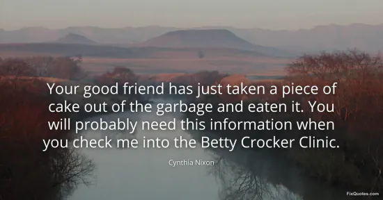 Nixon, Cynthia. "Your good friend has just taken a piece of cake out of the garbage and eaten it. You will probably need this information when you check me into the Betty Crocker Clinic." FixQuotes. January 15, 2026. https://fixquotes.com/quotes/your-good-friend-has-just-taken-a-piece-of-cake-162833/.