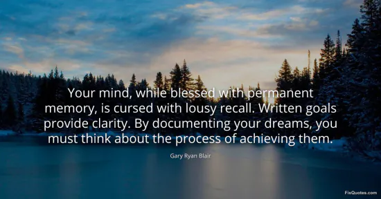 Blair, Gary Ryan. (2026, January 15). Your mind, while blessed with permanent memory, is cursed with lousy recall. Written goals provide clarity. By documenting your dreams, you must think about the process of achieving them. FixQuotes. https://fixquotes.com/quotes/your-mind-while-blessed-with-permanent-memory-is-143959/