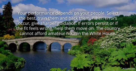 Rumsfeld, Donald. (2026, January 15). Your performance depends on your people. Select the best, train them and back them. When errors occur, give sharper guidance. If errors persist or if the fit feels wrong, help them move on. The country cannot afford amateur hour in the White House. FixQuotes. https://fixquotes.com/quotes/your-performance-depends-on-your-people-select-49898/