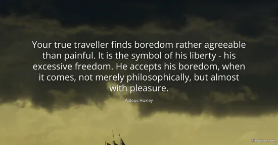 Boredom, in Huxley’s hands, isn’t a failure of imagination or a dead zone to be killed with distraction; it’s a luxury good. The “true traveller” is defined less by where he goes than by what he refuses to carry with him: schedules, compulsions, the anxious need to optimize every hour. By recasting boredom as “agreeable,” Huxley flips a modern insult into a quiet credential. If you can endure empty time without panic, you’re not merely passing through a place - you’re unhooked from the machinery that usually tells you what matters next.