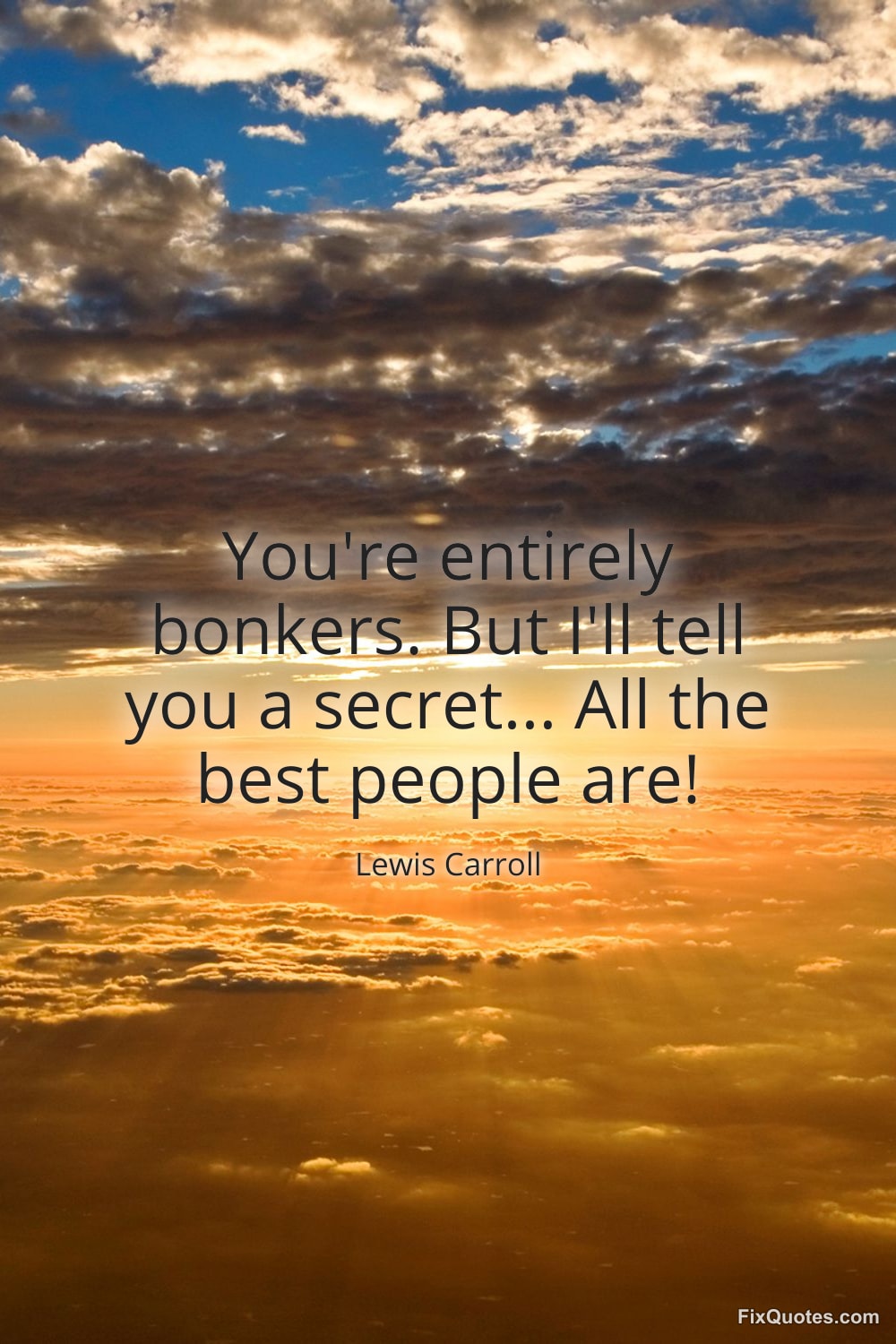 Carroll, Lewis. (2026, February 9). You're entirely bonkers. But I'll tell you a secret... All the best people are! FixQuotes. https://fixquotes.com/quotes/youre-entirely-bonkers-but-ill-tell-you-a-secret-173665/