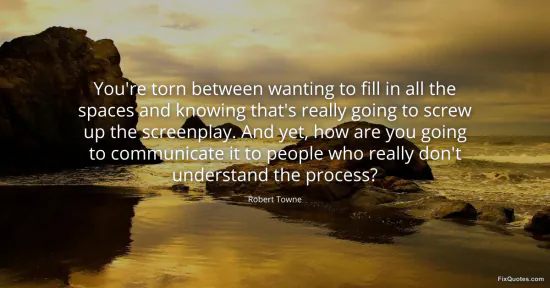 The line works because it captures a private argument every seasoned writer has with their own insecurity. Wanting to “fill in all the spaces” is the anxious part of the artist trying to preempt confusion, criticism, or executive notes. “Knowing that’s really going to screw up the screenplay” is the professional voice that understands cinema runs on selection: what you omit shapes rhythm, tone, and character. Towne’s blunt “really” is key - not “might weaken,” but “screw up,” the kind of language you use when you’ve watched a script die by a thousand explanatory cuts.