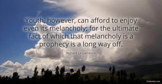 Gallienne, Richard Le. (2026, January 15). Youth, however, can afford to enjoy even its melancholy; for the ultimate fact of which that melancholy is a prophecy is a long way off. FixQuotes. https://fixquotes.com/quotes/youth-however-can-afford-to-enjoy-even-its-102044/