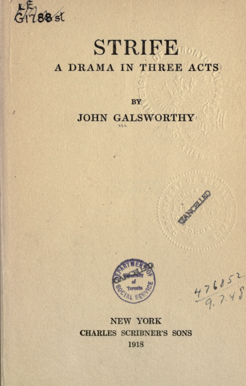 "Strife" (first performed in 1909) is a tightly focused industrial drama set in a single English company town during a bitter labor dispute. John Galsworthy centers the play on a strike at the Trenartha Tin Plate Works, but the real subject is less the economics of wages than the moral and psychological machinery that keeps a conflict grinding forward even when compromise would spare suffering. The action unfolds over a short span of time and mostly indoors, giving the story a pressurized, almost courtroom-like intensity as arguments, loyalties, and resentments collide.
