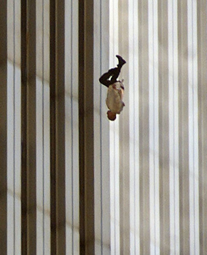 Iconic Associated Press photograph taken by Richard Drew on September 11, 2001, showing a man falling from the North Tower of the World Trade Center during the terrorist attacks. The image provoked widespread discussion about media ethics, anonymity, and the human toll of the attacks.